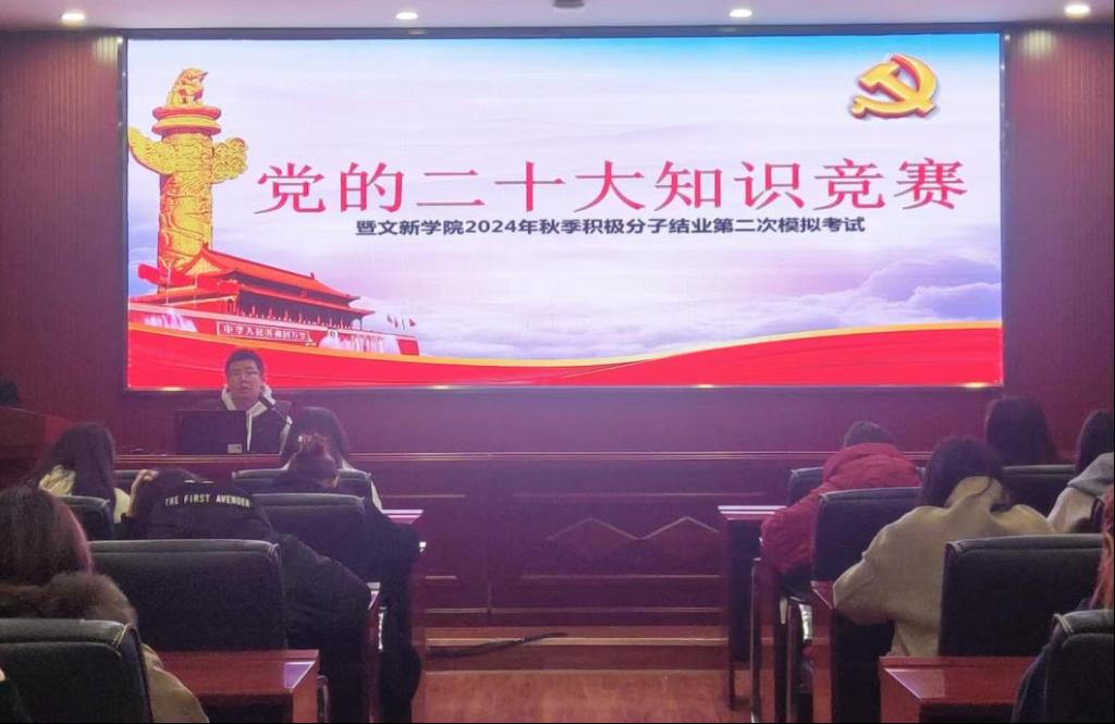 为贯彻落实党的二十大精神,积极探索“党建+互联网”新模式,进一步提升积极分子的理论知识水平,11月25日12时10分,“党的二十大知识竞赛暨文新学院2024年秋季积极分子第二次模拟考试”于必赢官网金盆岭校区九号教学楼218室成功举行。