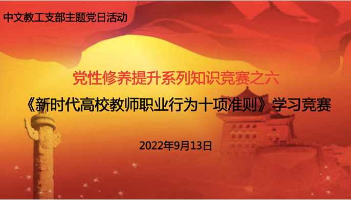 知识竞赛分男女党员教师两,通过线上、线下抢答等方式,主题党日的活动更具趣味性,支部党员的学习热情被进一步调动起来。后续中文教工支部将进一步加强集体学习、互相交流,并将习近平总书记在《努力实现高水平科技自立自强》中提出的“我国教育是能够培养出大师来的,我们要有这个自信”精神贯彻到教学、科研工作中,努力为迎接党的二十大、奋进新征程做出自己的贡献。(文、图/侯承相 /周云鹏