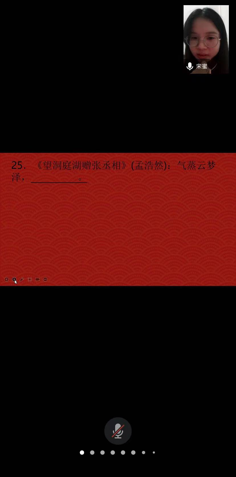 参赛选手分个人作答和分组对战两种比赛形式进行四轮比拼,以多样的赛制设计来多面的展示中国古典诗词的魅力。比赛共设有两名监测人员,每轮比赛过后统计参赛选手积分。每个比赛环节大家积极思考,比赛氛围热情高涨。经过三个环节如火如荼的比拼,五名选手进入最后的飞花令环节,几位实力强劲的选手争分夺秒,诗句接连不断,更是将大赛氛围推向了高潮。
