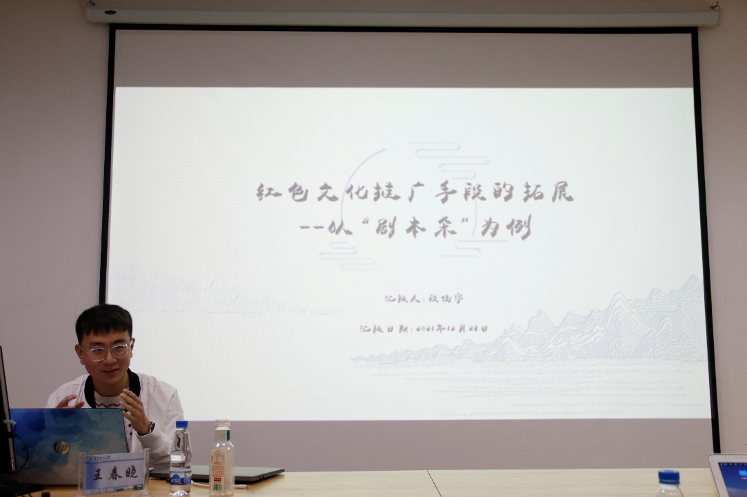 在学生分享环节中,20级新传硕士研究生毛敬莲和21级新传硕士研究生段饶宇分别做了主题分享汇报。首先,毛敬莲以“互动仪式链视角下主流媒体公益直播中的互动分析”为题,以“小朱配琦”公益直播为研究对象,以柯林斯的互动仪式链为理论基础,从互动要素、互动结果两个维度分析主流媒体公益直播的基本运行机制。分享结束后,王春晓与其探讨了理论与材料的结合问题。随后,段饶宇以“红色文化推广手段的拓展”为题,以新式社交游戏剧本杀为研究对象,对红色文化推广手段拓展的可能性进行了探讨。分享结束后,王春晓肯定了段饶宇研究方向的新颖性,并为之后的研究提出了宝贵的建议。