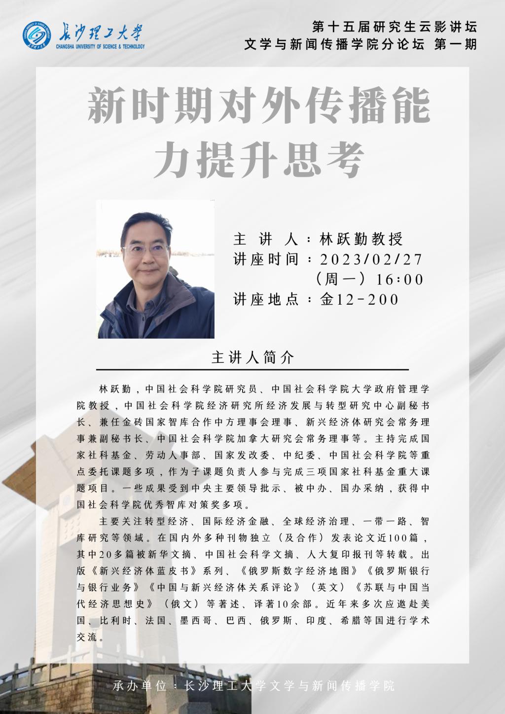 2023年2月27日下午,在437必赢会员中心金盆岭校区12号教学楼内,第十五届研究生云影讲坛文新学院分论坛第一期如约进行。本次讲座邀请中国社会科学院研究院林跃勤教授为学生们讲授主题为“新时期对外传播能力提升思考”的讲座。
