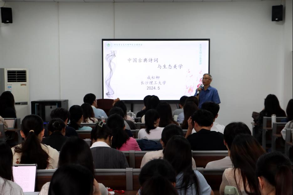 2024年5月21日下午,437必赢会员中心文新学院通识讲座暨人文素质大讲堂之“中国古典诗词与生态美学”专题讲座在金盆岭校区9教417室举行。湖南省人民政府参事、中文系二级教授成松柳老师为长理师生带来了一场富有人文气息的古典诗词盛宴。成松柳教授首先对“古典诗词生态美学的艺术呈现”进行了阐述。他将中国古典诗词生态美学的呈现方式分为“自然本身的和谐”、“人与自然万物的和谐”、“人与社会的和谐”三个方面,以李白、王维、刘禹锡、张孝祥、朱熹等人的传世诗词为例,围绕“楼观岳阳尽,川迥洞庭开”“相看两不厌,唯有敬亭山”“空山不见人,但闻人语响”“试问西山雨,何如湘水春”进行了诗意解读,详细阐释了“主客一体”“仁爱万物”“江山之助”“天地境界”等观点。成松柳教授提出:中国古代诗歌并非纯粹客观地描摹自然风物,古代文人将浓厚意趣与真挚情感熔铸于自然山水,体现了对自然的审美感知,这种与自然的亲近友好关系承载着博大深沉的生命情怀。