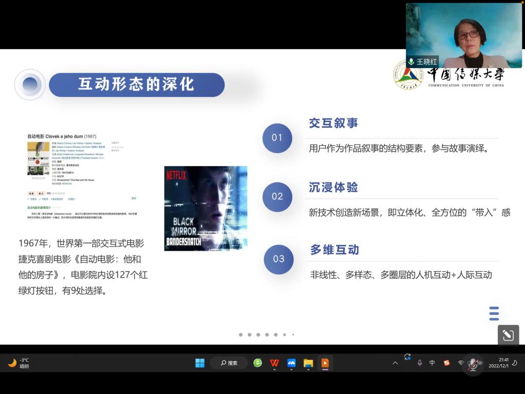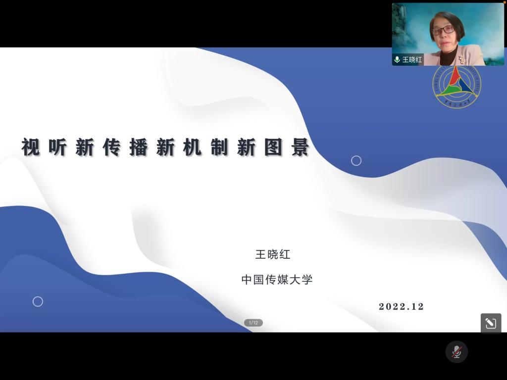 2022年12月1日晚,第十四届研究生云影讲坛文学与新闻传播学院分论坛第五期如期举行。中国传媒大学本科生院院长王晓红教授应邀为必赢官网师生开展主题为“视听新传播新机制新图景”的讲座。本次讲座以线上的方式进行,院长刘建新教授担任主持,赵继光老师、陈健强老师参与讲座。