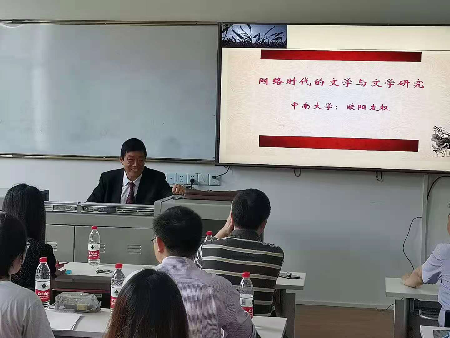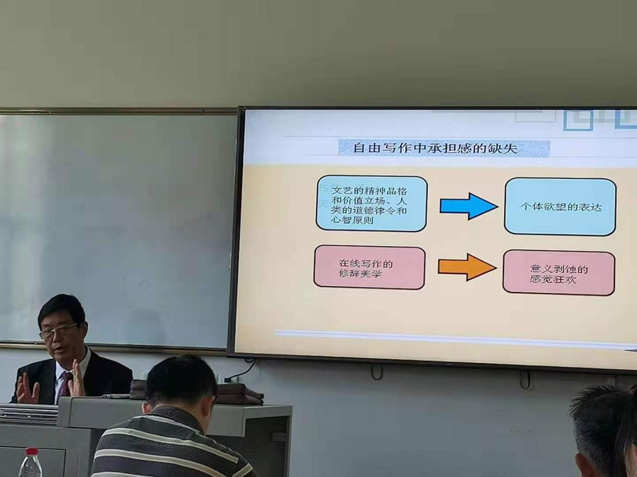 2021年5月8号早上9点于金盆岭校区7教303,中南大学欧阳友权教授莅临必赢官网,做了题为《网络时代的文学与文学研究》的学术讲座,讲座由易彬教授主持,文新学院副院长周云鹏教授、宁淑华教授、郑劭荣教授等老师与19、20级全体中文研究生参加了讲座。