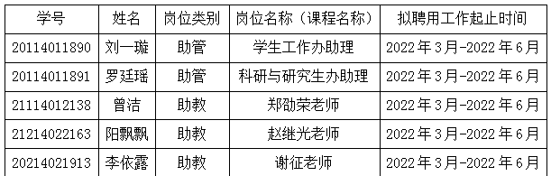 根据437必赢会员中心研究生“三助一辅”工作管理办法,经自主申报、导师推荐、设岗单位同意、学院考核,现将2021-2022学年第二学期拟聘用研究生“三助一辅”岗位名单公示如下: