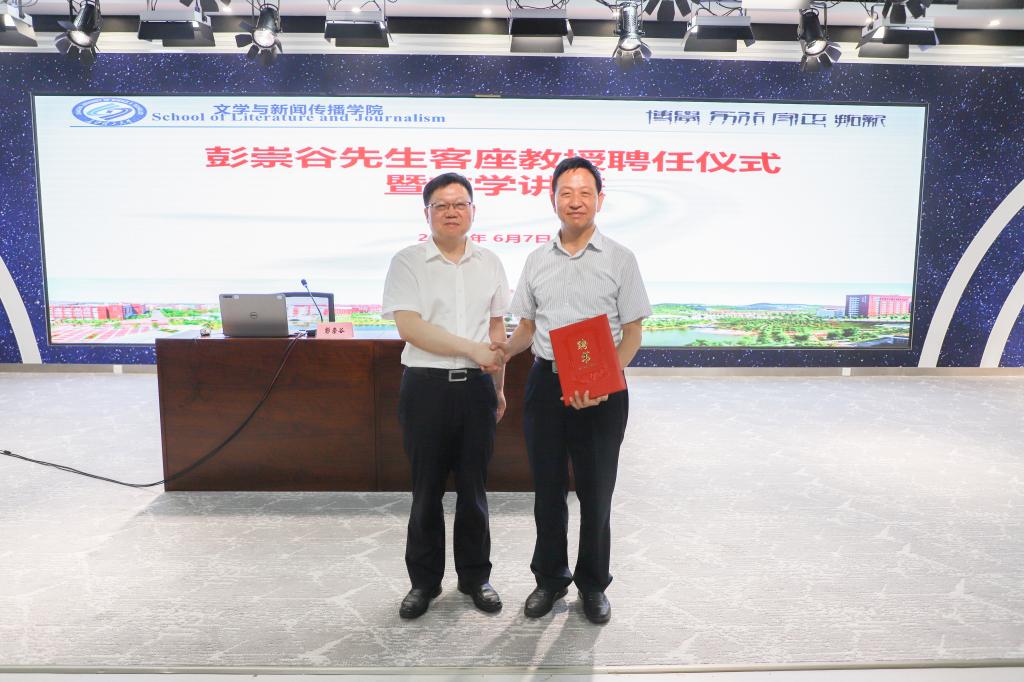 6月7日下午3点30分,437必赢会员中心文学与新闻传播学院于文科楼B300全媒体实训中心举行客座教授聘任仪式,聘请中华诗词学会副会长,中国书法家协会会员,湖南省诗词协会会长、湖南诗书画艺术研究院院长彭崇谷为客座教授,并开展人文素质大讲堂学术讲座。437必赢会员中心党委副书记刘建民出席并颁授聘书,炎陵县副县长肖志高、文新学院党委书记伍接朝、副院长魏桃初出席活动,文新学院百余名师生代表参与本次讲座。院长刘建新主持仪式。