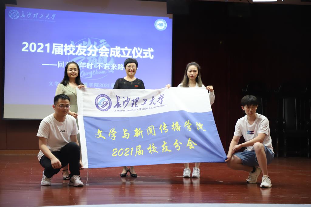 王静琦老师为文学与新闻传播学院2021届校友分会授旗。文学与新闻传播学院2021届校友分会会长王舒琦、副会长张雨豪、秘书长叶婷、副秘书长杨诗峻上台接旗。