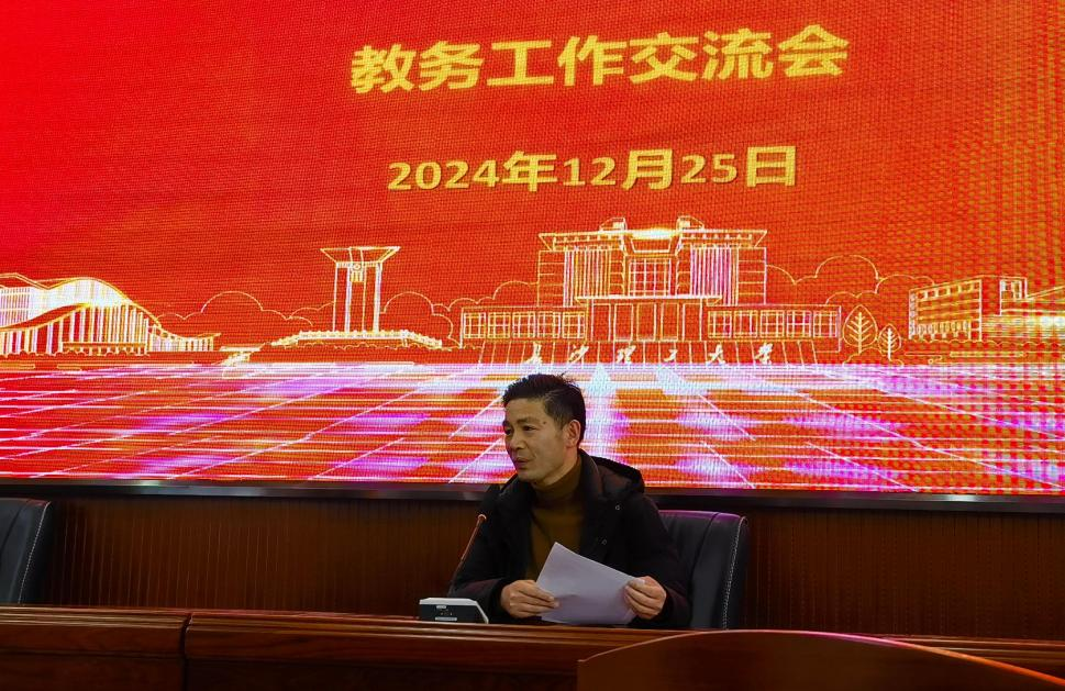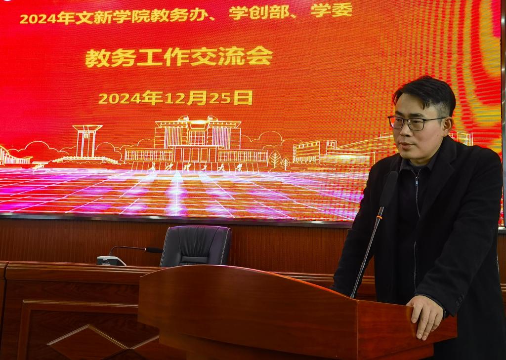为保障学院教学工作正常运行,提高教务工作效率,2024年12月25日下午两点半开始,学院教务办在9教218会议室,组织召开了教务工作交流会。刘建新院长,党委委员兼中文系主任、负责学院教学工作的侯承相老师,教务办工作人员,以及学创部与各班学习委员等共40余人参加了会议。