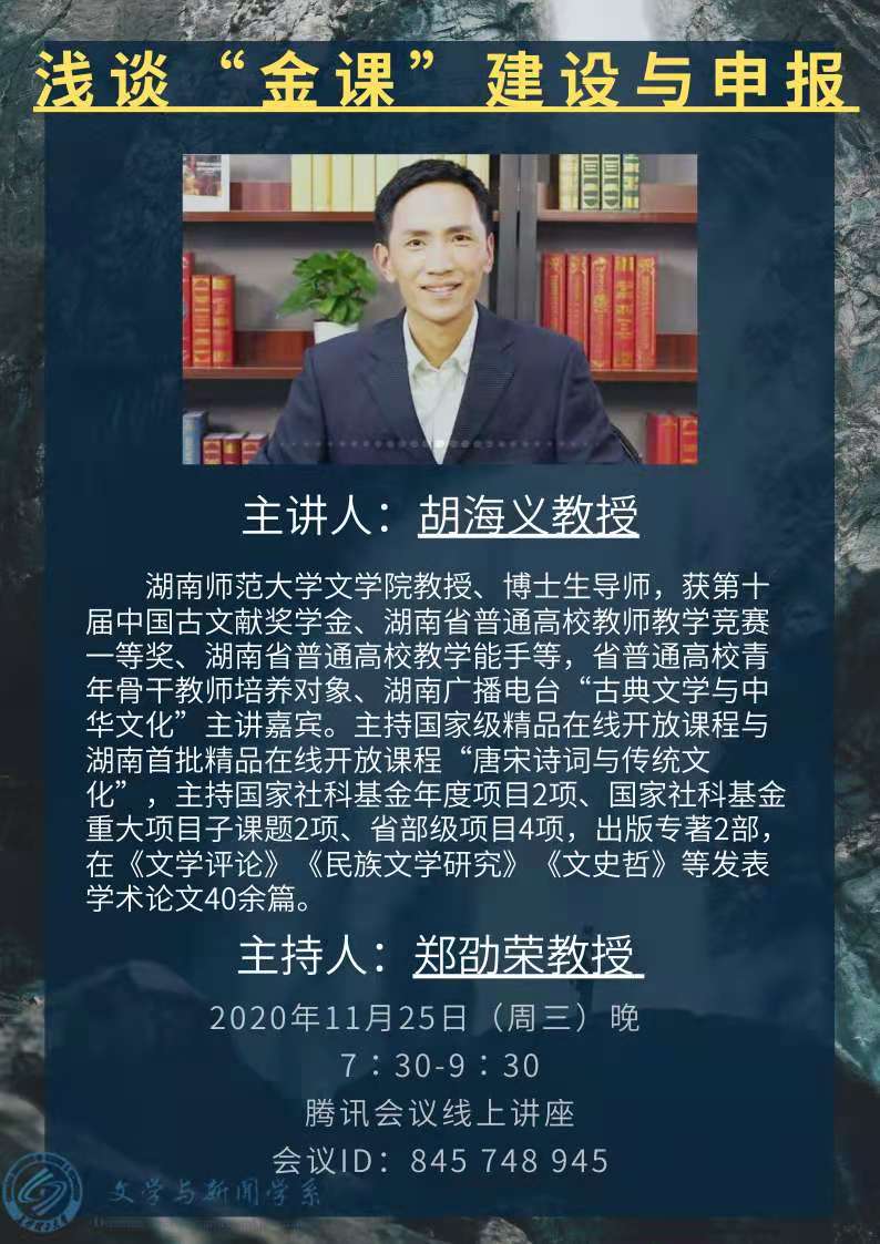报告人简介: 胡海义,湖南师范大学文学院教授、博士生导师,获第十届中国古文献奖学金、湖南省普通高校教师教学竞赛一等奖、湖南省普通高校教学能手等,省普通高校青年骨干教师培养对象、湖南广播电台“古典文学与中华文化”主讲嘉宾。主持国家级精品在线开放课程与湖南省首批精品在线开放课程“唐宋诗词与传统文化”,主持国家社科基金年度项目2项、国家社科基金重大项目子课题2项、省部级项目4项,出版专著2部,在《文学评论》《民族文学研究》《文史哲》等发表学术论文40余篇。