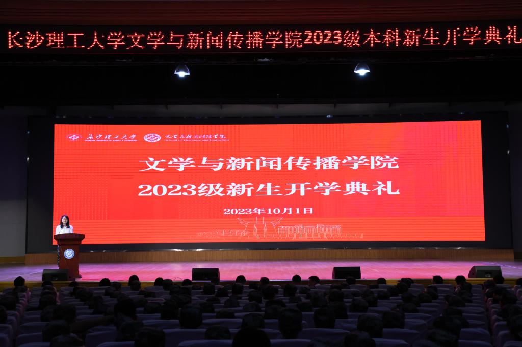 2023年10月1日上午,437必赢会员中心文学与新闻传播学院在金盆岭校区5教报告厅举行2023级本科新生开学典礼,院长刘建新、院党委副书记(主持工作)陈仁凯、副院长周云鹏、戴钰、院党委委员郑劭荣、优秀校友曾高飞、蔺晨阳、系部主任、支书、行政办公室主任、新生班主任及辅导员出席,全体2023级新生参加。典礼由院党委副书记刘莎主持。