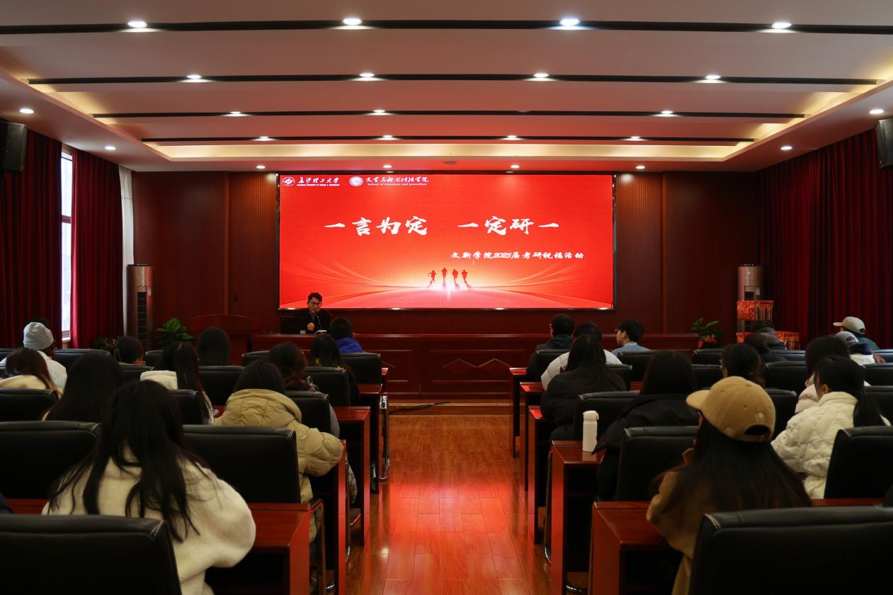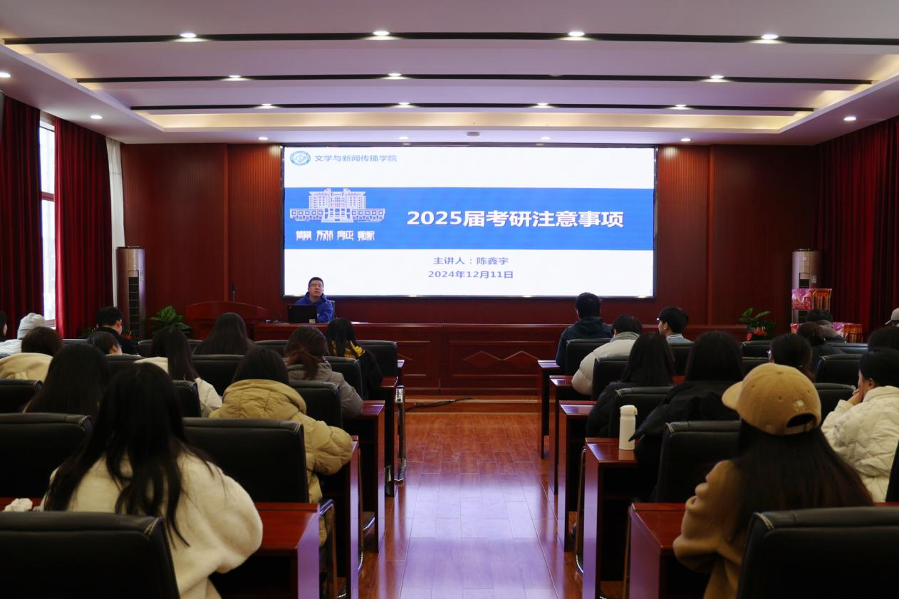 我院于12月11日上午10点,在九教218举行了2025届考研祝福活动,院党委副书记刘莎、副院长戴钰、中文系主任侯承相出席本次大会,2021级本科生辅导员陈鑫宇主持,全体2025届考研人参加。