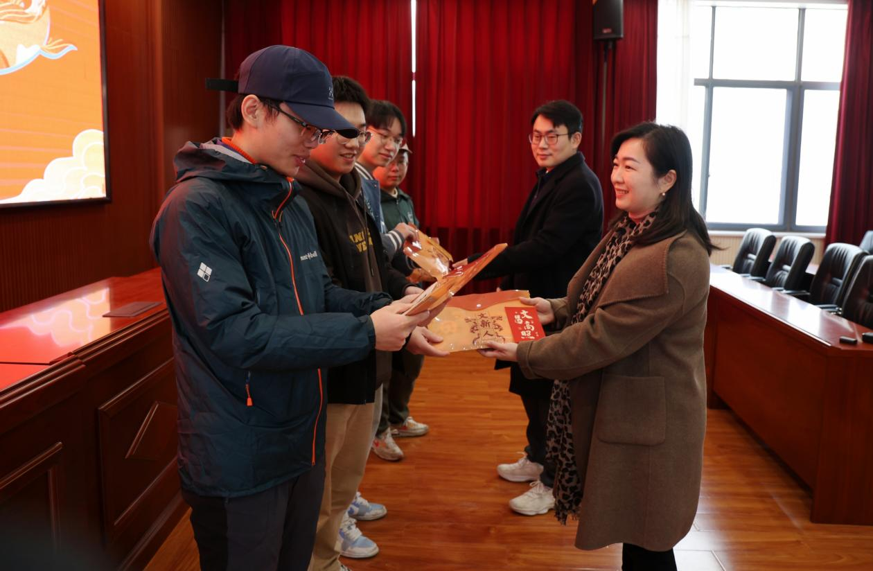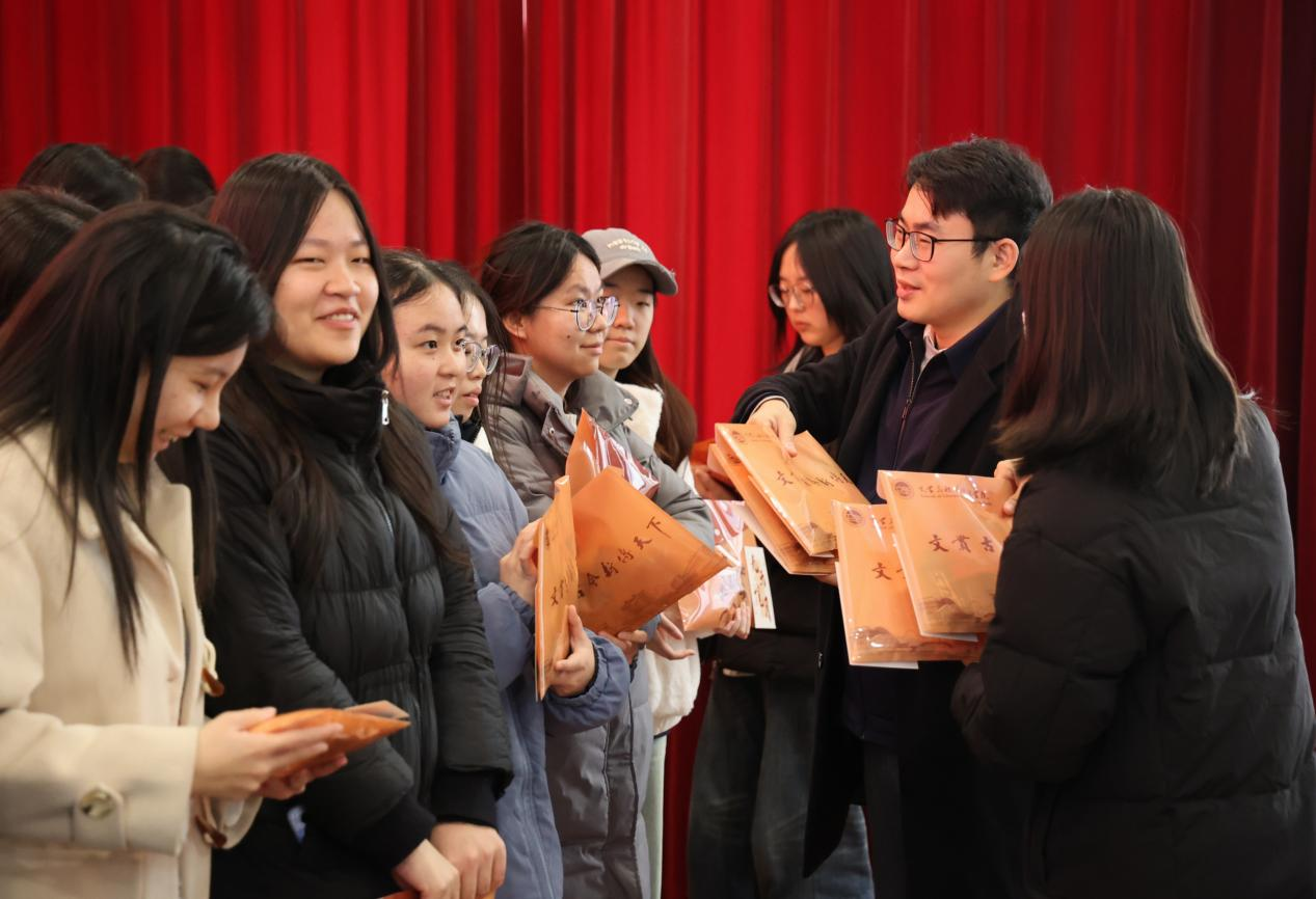本次活动,学院为同学们准备了助研礼包,内含祝福明信片、纸巾、暖手宝、蒸汽眼罩、巧克力和“逢考必过”饼干。陈鑫宇向同学们介绍了礼包各物品的功能,旨在尽可能为同学们提供便利,也为大家送上全院师生的美好期许与心意。刘莎、戴钰、侯承相为同学们发放。