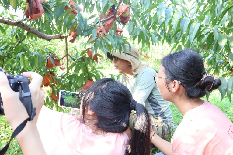 “我们现在所在的地方(月亮湖生态农林科技园)就是新邵县乡村振兴产业基地,占地560亩,集休闲、采摘、观光于一体。园区内配套设施齐全,拥有自行车赛道、游步道、观景台和休闲长廊,采取‘公司+专业合作社+农户’的生产经营模式,现有水果基地400多亩,包括黄桃基地、无花果基地、草莓基地等,这片天地广阔着哩!”月亮湖生态农林科技园刘沛基主管带着实践团成员们逐一介绍黄桃园、黄金奈李园,以树枝上的饱满果实为“生动教具”,讲解相关种植注意事项。