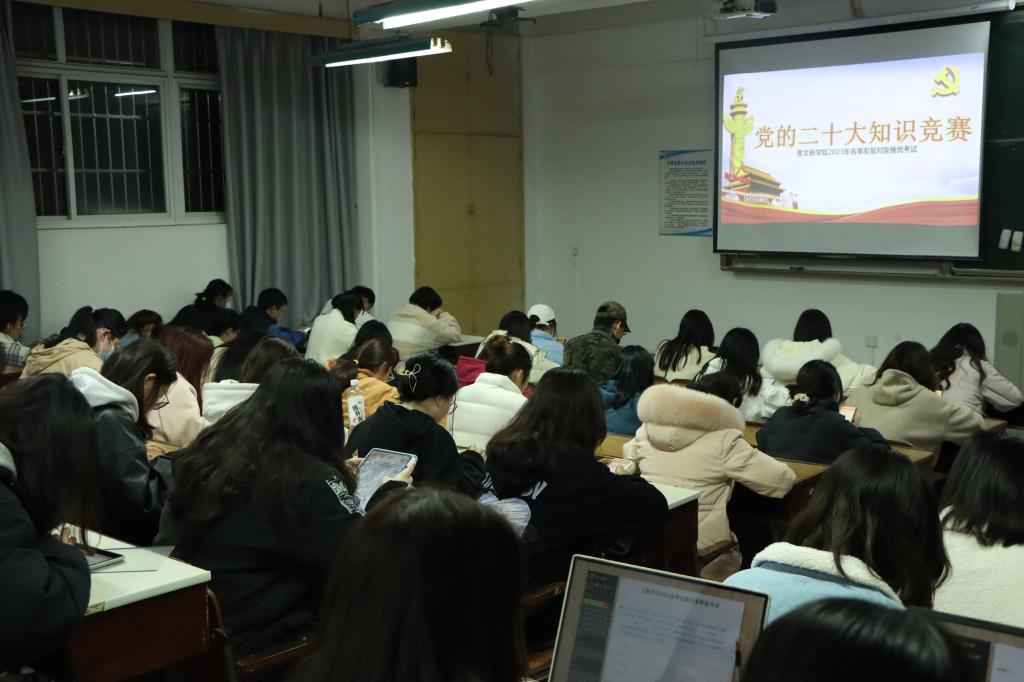 为深入学习与深刻贯彻落实党的二十大精神,积极探索“互联网+党建”新模式,进一步提升入党积极分子的理论知识能力水平,2023年3月28日晚7点30分,“党的二十大知识竞赛暨文新学院2023年春季发展对象推优考试”于必赢官网金盆岭校区三号教学楼成功举行。