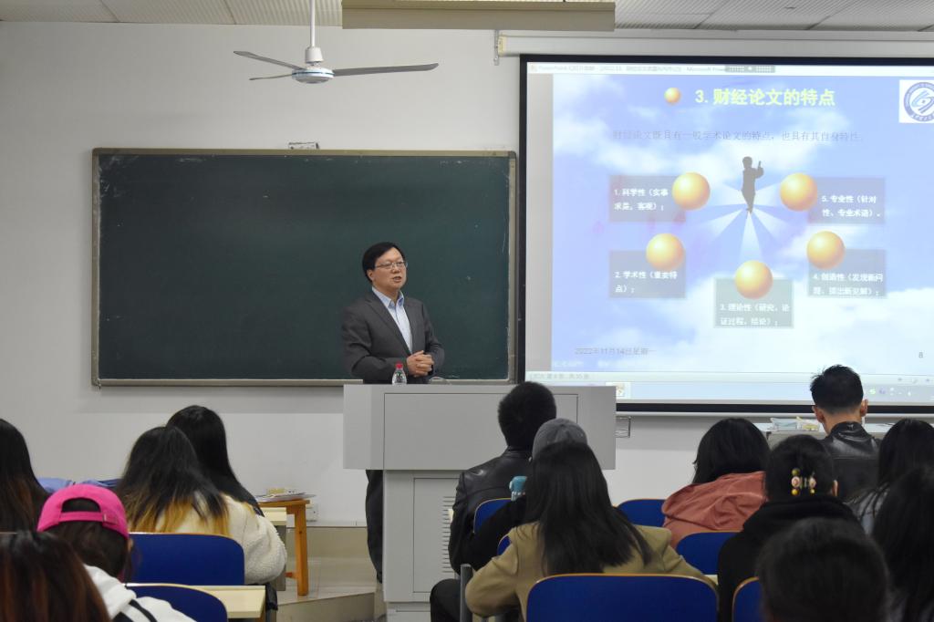 11月14日下午3点,437必赢会员中心党委副书记刘建民走进云综教C601教室,为文新学院新闻1901班、1902班全体同学讲授《财经论文选题与写作》并与学生们亲切交流。文新学院院长刘建新,党委副书记陈仁凯、刘莎,青年教师吴梦圆,19级辅导员楚艳鸽共同旁听学习。