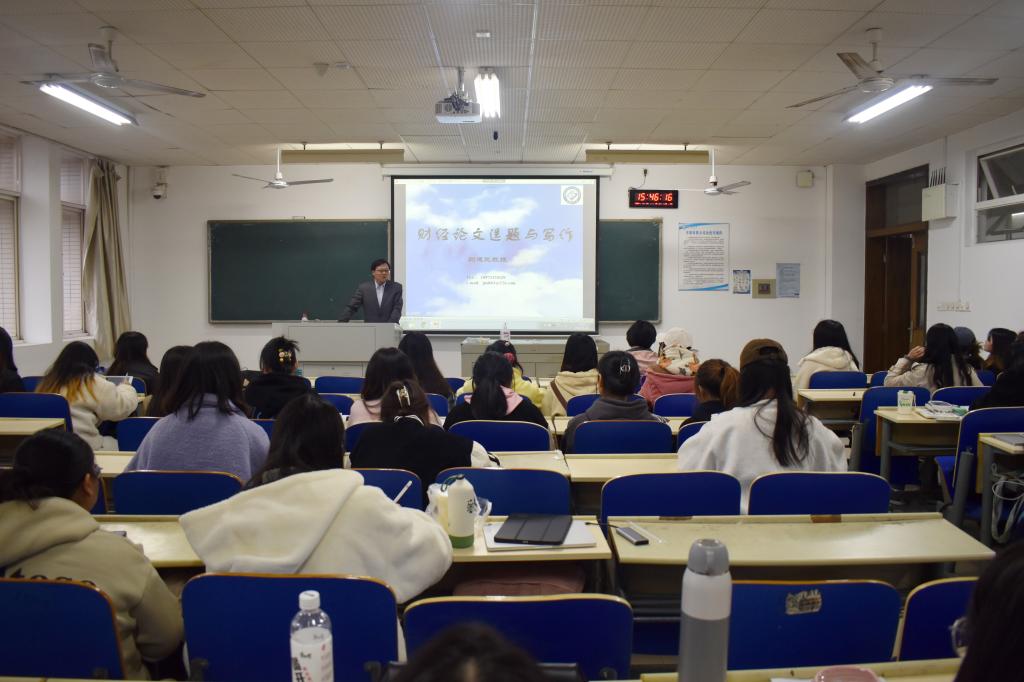 刘建民通过财经论文概述、财经论文选题、财经论文写作三部分开启了本次授课,他以“秧好一半谷,妻好一半福,题好一半文”的古语为引阐述选题的重要性,他指出选题要围绕“有意义、有兴趣、有准备、有基础、有创新”等五个方面入手。他强调论文写作基本原理相通,细致阐述了选定题目、文献搜集、草拟提纲、撰写初稿、论文修改和定稿投稿等六个完整环节的注意事项,勉励同学们在论文写作中要结合中国国情、寻找学科交叉点、做好文献搜集、敢于发现和解决问题,从而在论文写作中实现题目“养眼”,框架“养心”,内容“养脑”。刘建民通过领学党的二十大报告,引导同学们加深对党的创新理论成果的领悟和理解,勉励未来的新闻从业者们主动增强政治素养,用手中的笔书写时代华章。