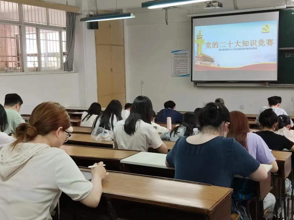 为深入落实并贯彻落实党的二十大精神,积极探索“互联网+党建”的新模式,进一步提升党员发展对象的理论知识能力水平,2023年6月6日13点30分,“党的二十大知识竞赛暨文新学院2023年春季发展对象结业考试”于必赢官网金盆岭校区三号教学楼成功举行。