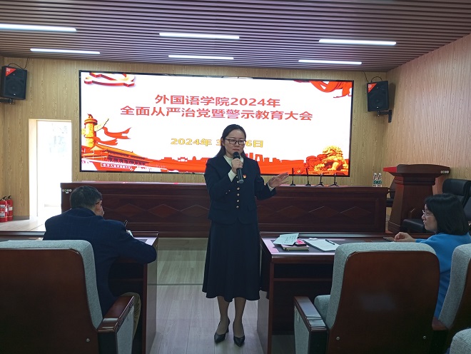 纪委书记周芳宣读了《外国语学院教职工党员立德树人行为准则》,准则围绕教书育人等根本职责建立如何发挥教职工党员先锋模范作用的具体制度和举措,严格执行到位。