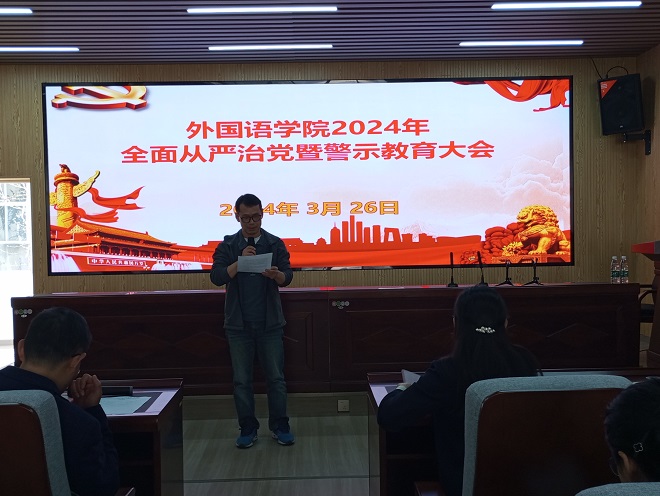 为推动全面从严治党向纵深发展,筑牢广大党员干部反腐倡廉的思想道德防线,3月26日下午,学院在金盆岭校区3号教学楼229报告厅召开2024年全面从严治党暨警示教育大会,学院党政班子成员、全体教工党员参会。会议由院长段胜峰主持。