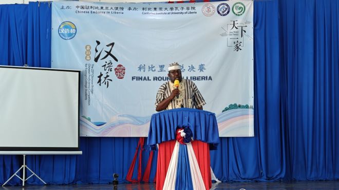 2024517日,利比里亚大学孔子学院在利大国会山校区隆重举办了第23届“汉语桥”世界大学生中文比赛预选赛利比里亚赛区总决赛。中国驻利大使尹承武阁下、利比里亚教育部助理部长Nyensuah女士、利比里亚广播电台台长Faghon先生、利比里亚大学代理校长Taylor教授、中资企业和机构代表以及利大孔院师生近300人参与活动。部分孔院教学点学生和武术课堂的学员进行了暖场表演。利国多家主流电视、广播及网络媒体对此次活动进行了现场直播和新闻报道。