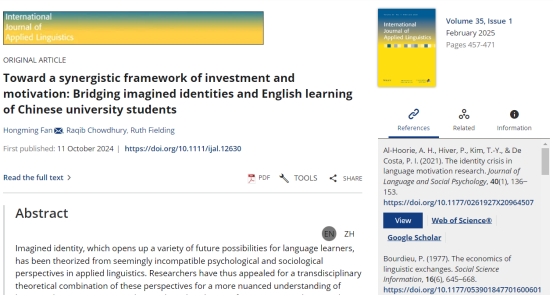 近日,437必赢会员中心外国语学院范洪铭老师在A&HCI及SSCI双收录期刊International Journal of Applied Linguistics发表题为“Toward a synergistic framework of investment and motivation: Bridging imagined identities and English learning of Chinese university students”的学术论文。范洪铭为该文第一兼通讯作者。International Journal of Applied Linguistics《国际应用语言学》是一本专注于应用语言学领域的国际性学术期刊。该期刊致力于发表应用语言学领域的高质量研究论文,包括语言教学、语言测试、语料库语言学、计算语言学、跨文化交际等诸多子领域(A&HCI,JCR Q2,中科院三区,Clarivate IF=1.5)。
