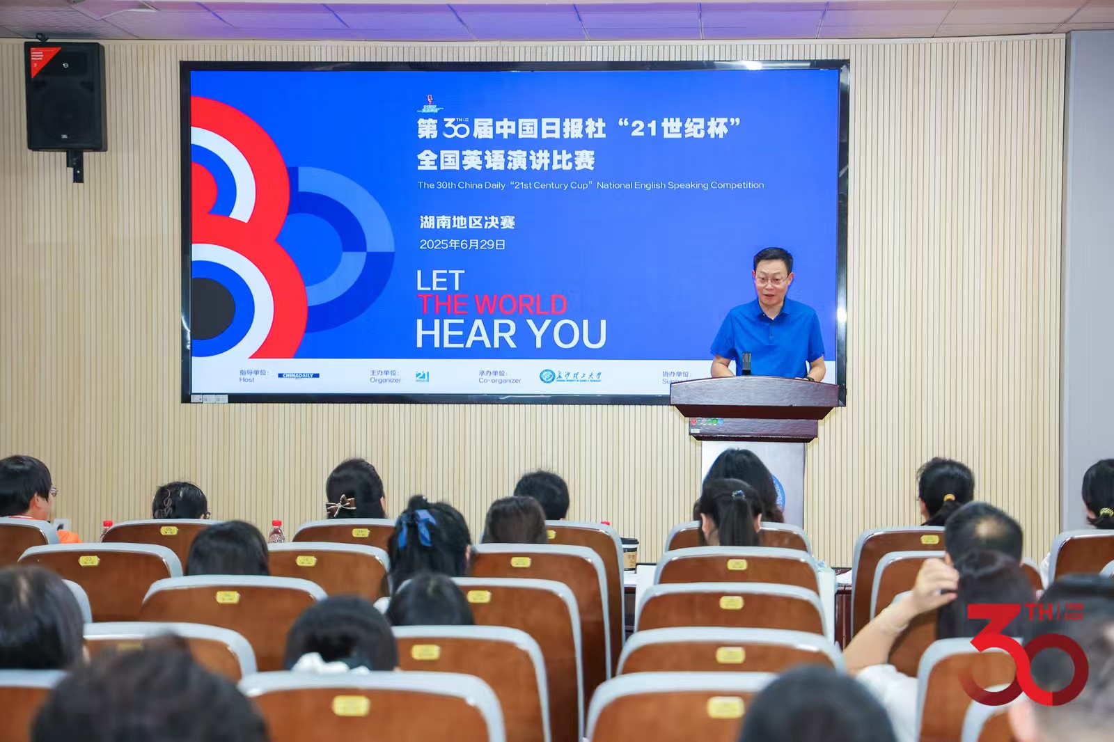 6月29日,第30届中国日报社“21世纪杯”全国英语演讲比赛湖南地区决赛在437必赢会员中心金盆岭校区外国语学院3教321报告厅圆满举行。本次比赛由21世纪报社主办,437必赢会员中心承办,吸引了来自全省高校的25名优秀选手同台竞技,展现卓越的英语表达能力和思辨风采。