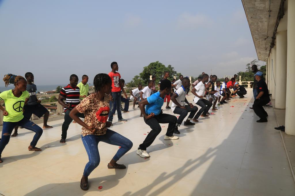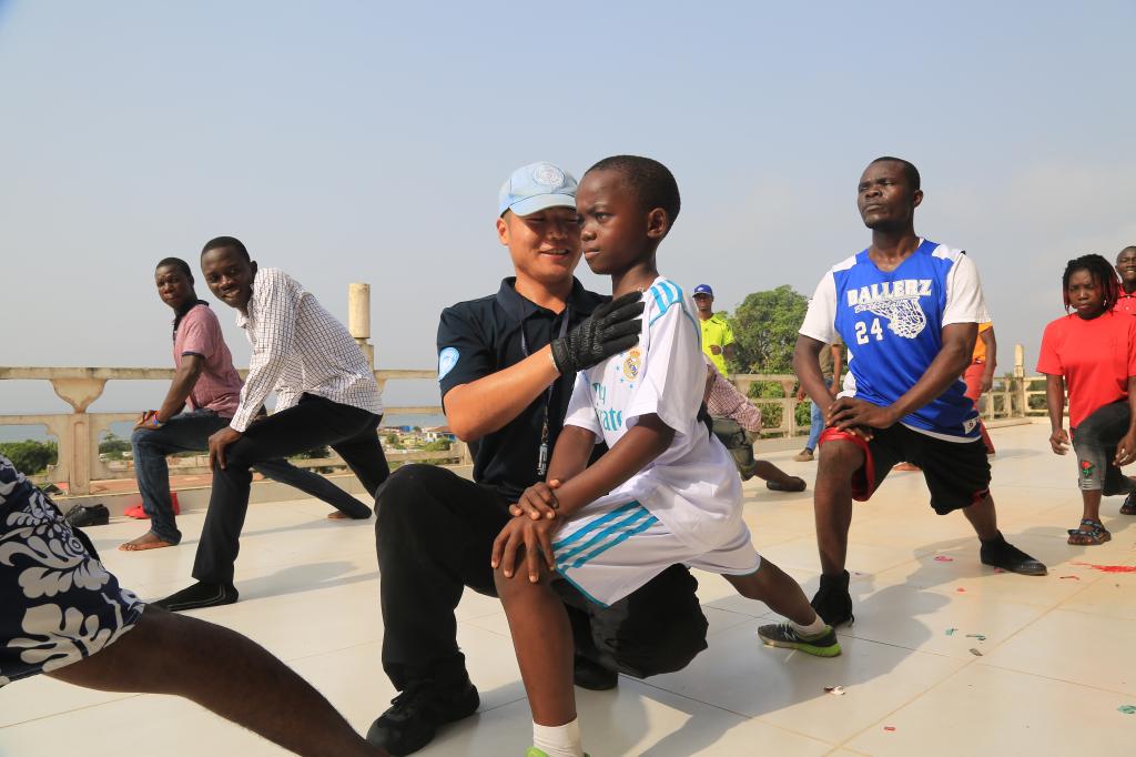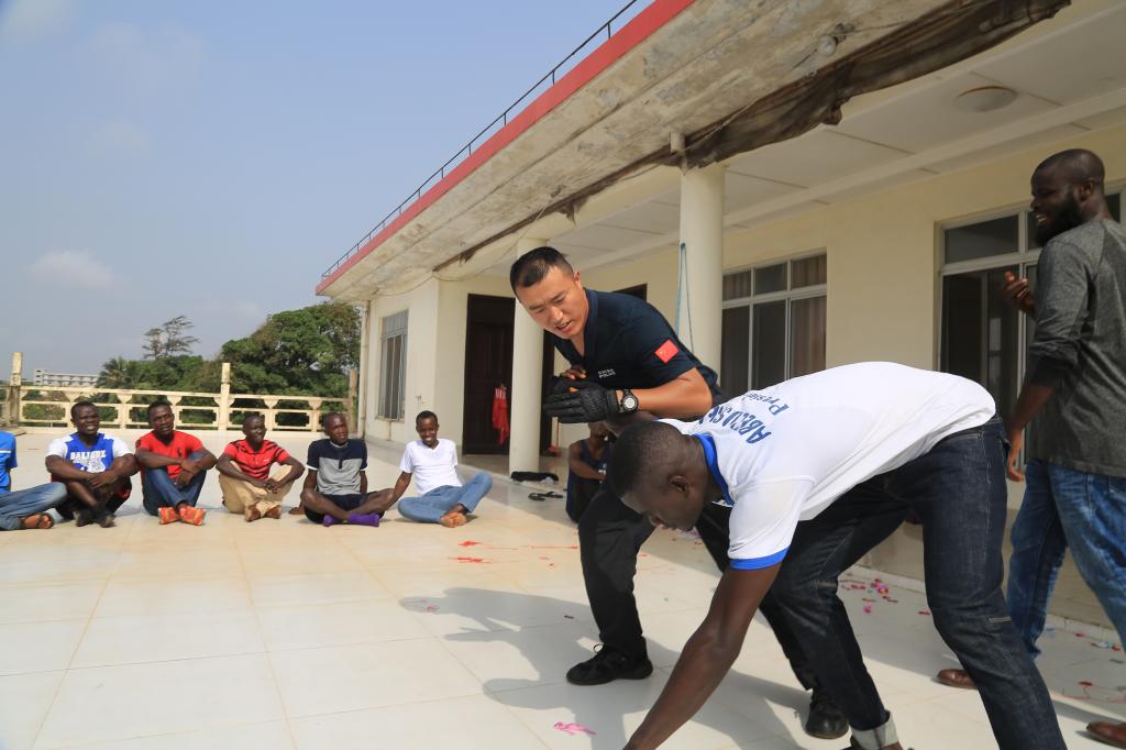 活动伊始,黄柏青院长对武术教练们的到来表示热烈的欢迎,并向他们表达了真诚地问候和诚挚的谢意。接着,黄院长向在场的学生和老师介绍了两位武术教练,他们均来自中国第五支驻利比里亚维和警察防暴队,教练员们擅长十八般兵器,九长九短,尤其擅长枪、棍、刀、剑、鞭。每逢联合国重大节日和重要活动,他们都会为各国到访嘉宾表演中华武术,传播中华文化,令人敬佩不已。之后,教练员们向学生介绍了中华武术的内涵,并向学生介绍了中华武术的基础动作和基本套路。同学们非常积极、认真地听讲,现场气氛十分高涨。教练员们一声哨令,正式开始学习。教练员们首先向学生展示了五步拳和一些擒拿动作,这另在场学生钦佩不已,掌声不断。学生也积极配合,积极参与,跟着教练员们的动作认真学习。在烈日炎炎下,有些学生还趁下课间歇时间单独找教练学习擒拿动作,并得到了教练的认可。掌声和欢呼声此起彼伏,现场气氛达到高潮。历时三个小时的介绍和学习,同学们对中华武术有了深刻的认识,也更加了解了中华武术的精髓在于自修自律,以武会友。通过习武者的练习,内养精神,外健体魄,控制暴力而不是滥用暴力。活动在全体合影中落下帷幕。
