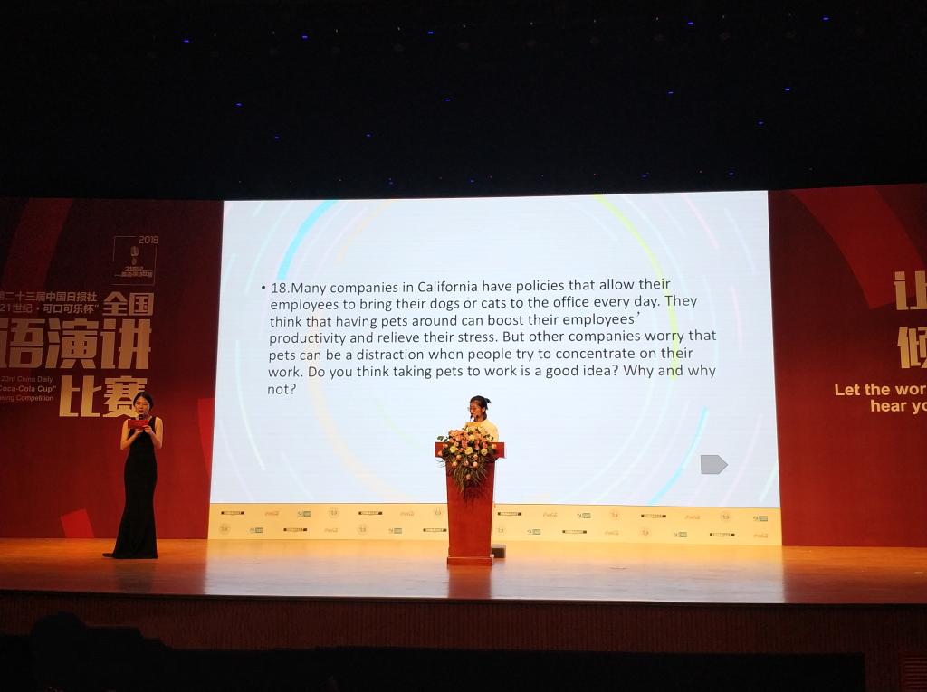 4月12日至15日,第二十三届中国日报社“21世纪 •可口可乐杯”全国英语演讲比赛(大学组)总决赛在杭州师范大学举行。来自中国大陆及港澳台地区的72所高校选手齐聚杭州展开激烈角逐。必赢官网2016级环境工程专业学生余大婷在外国语学院公共外语部谷丰老师的指导下参加了比赛。