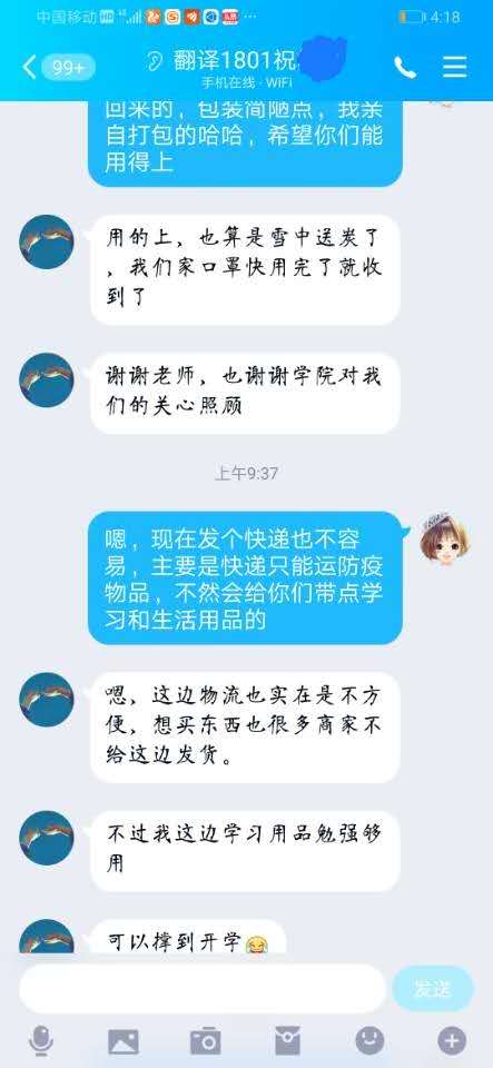 “收到班主任亲笔写的书信非常开心,学院寄送的口罩也是雪中送炭,家里防疫口罩刚好没货了,感恩学院对我们的关心和照顾。”翻译班的祝同学收到母校来信和慰问品后,内心充满了感激。