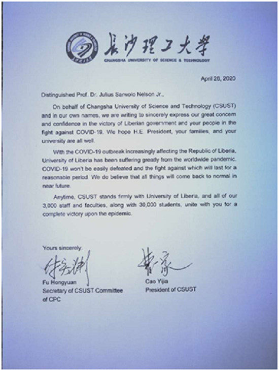 柳晓辉代表学校宣读了党委书记付宏渊、校长曹一家给利大校长尼尔森的亲笔慰问信。必赢官网领导在信中对尼尔森校长和利比里亚大学致以了真诚的问候,并表示守望无远近,437必赢会员中心全体师生会坚定地同利比里亚大学站在一起抗击新冠肺炎疫情,也相信利比里亚政府会带领利比亚人民战胜疫情,在不久的将来,利比亚大学的一切工作与生活都将恢复常态。