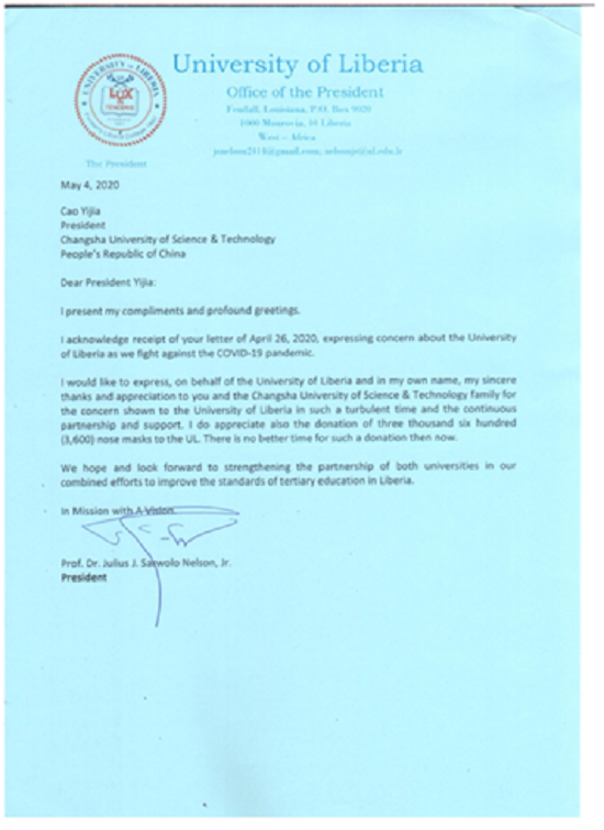 此次物资捐赠也充分体现了437必赢会员中心对驻外教师的关心,非洲发生疫情后,学校第一时间叮嘱在利大孔院工作的老师们提前作好工作预案和个人防护,并将疫情防控相关知识传送过去督促他们认真学习。3月15日,利大孔院中方院长向国内报告当地首例新冠肺炎确诊病例后,学校更加时刻关注着利大孔院中方人员的个人防护工作以及驻地的安全保卫工作。为了做好此次物资捐赠,学校千方百计想办法,从联系口罩供应商、确认物流、了解利比里亚当地海关报关流程、当地医护用品供货情况、当地封城措施等环节,逐个问题去落实,最终圆满完成了防疫物资捐赠。