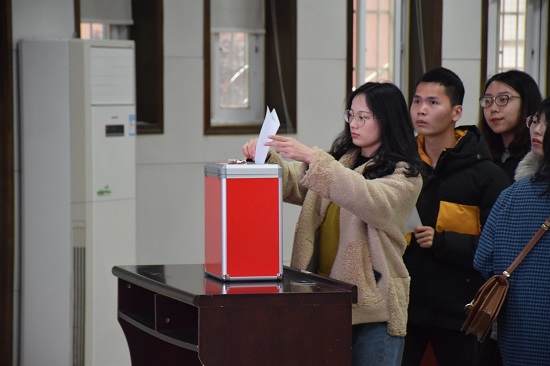 选举之前,汪功伟通读了《外国语学院学院党代表选举办法(草案)》、黄坚宣读了候选人预备人选名单、冯春宣读了监票人计票人名单。段胜峰说明了准备会议阶段,学院严格执行“三上三下”的基本原则,由各个党支部推荐提名,提出推荐人选初步名单上报学院,学院提出推荐人建议名单,发到党总支部征求意见,第二步,学院党委将推荐人上报至学校,征求学校意见,有了前期的良好基础,使得本次大会顺利召开,我院秉承严格履行党章,认真贯彻执行民主集中制,把充分发扬党内民主、坚持走群众路线贯彻于选举当中,代表的选举采取自上而下、上下结合、反复酝酿、逐级遴选的办法进行。最终在会议前拟定候选人有9名(其中包括一名学生党员)来进行差额选举。并在会议上一一对候选人进行介绍,要求各位党员代表,本着认真负责的态度来填写选票,用好选举权,确保选举工作的严肃性和有效性,以保证学院出席学校党代表大会选举工作顺利进行。