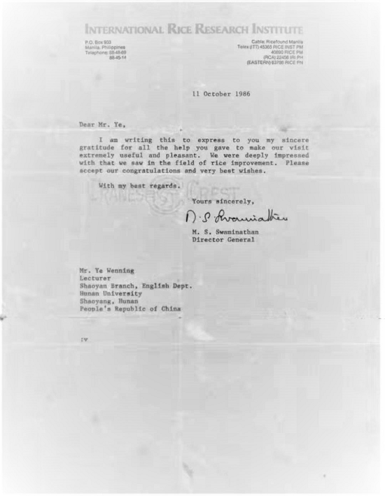 (国际水稻研究所所长斯瓦米纳森博士致本人的感谢信)