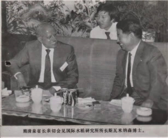 (湖南省省长熊清泉先生接见国际水稻研究所所长斯瓦米纳森博士,图中为本人)