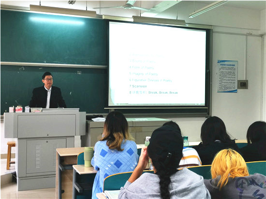 在讲座中,刘更祥副教授从诗歌形式、格律诗歌分类、格律诗歌分析方法、诗歌意象等方面介绍了英语诗歌入门知识,并以《一朵红红的玫瑰》为例,引导学生如何对诗歌进行分析与赏析,初步培养同学们独立阅读英语诗歌的能力。