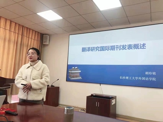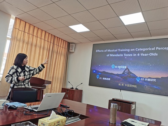 随后,支部党员在热烈的理论学习氛围中,开展“我为群众办实事”的主题党日活动。姚尧和胡珍铭结合自身科研实践经验,就“助力专业教师科研动力提升——国际期刊论文撰写与发表经验交流”主题,与在座老师进行思想交流。胡珍铭介绍了翻译研究的11种国际期刊,包括其选题特点、审稿时长和收稿篇幅等,并分析了SSCI论文的写作要求、论文特征及修改时要注意的问题。姚尧则以她发表的论文Effects of Music Training on Categorical Perception of Mandarin Tones in 4-Year-Olds为例,从明确选题、开展研究和写作投稿三个阶段,分享了论文从无到有的发表过程。参与活动的老师们认为本次活动非常具有针对性和实用性,结合自身研究方向,就国际期刊投稿方法、突破难点等问题虚心请教,两位老师一一耐心解答。本次交流会学术氛围浓厚,讨论热烈,对增强学院科研能力建设水平,激发科研创新动力具有重要意义。