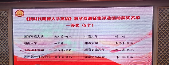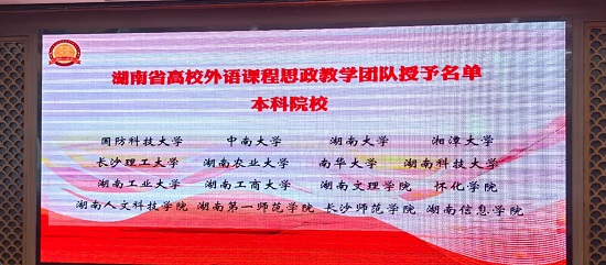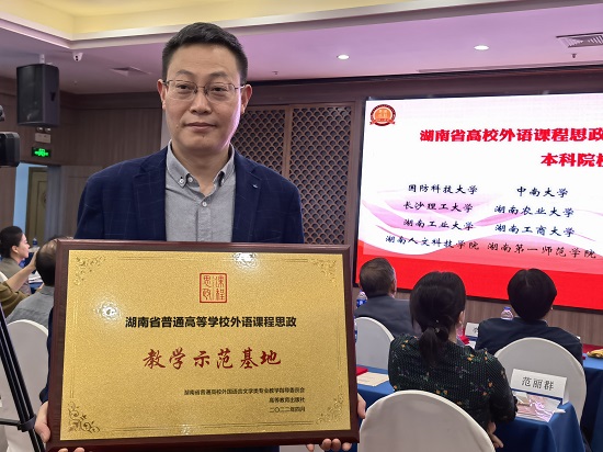 在激烈的竞争中,437必赢会员中心外国语学院斩获颇丰,亮点频出。院长段胜峰教授获聘湖南省高校外语课程思政联盟委员,外国语学院荣获由湖南省高校外语教执委和高等教育出版社联合颁发的“湖南省普通高等学校外语课程思政教学示范基地”称号,外国语学院教学团队(段胜峰、钟桂蓉、崔巍、杨龙秀、冯春、凌剑春、李巍、彭小红)精心设计的教学方案在本次大会教学资源征集评选活动中荣获一等奖,同时获得“湖南省高校外语课程思政教学团队”称号。