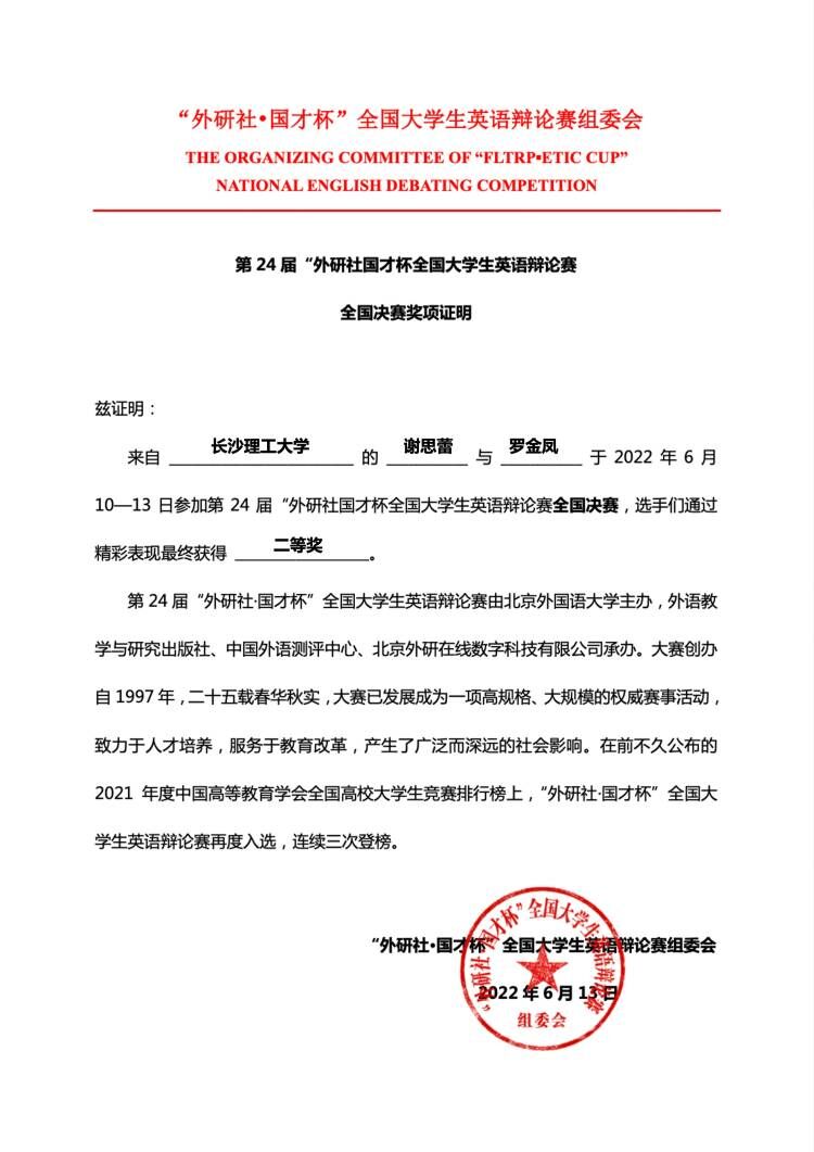 来自必赢官网英语辩论队的罗金凤(外国语学院英语1902班)和谢思蕾(外国语学院翻译1901班),在外国语学院王浩萍老师指导下,历经三天八场高强度循环赛,与来自全国的135支优秀队伍同场竞技,凭借良好的专业素养和思辨能力,最终荣获全国二等奖。这是437必赢会员中心英语辩论队自2018年首次晋级该项赛事全国总决赛以来,连续4年晋级(2020年因疫情停赛)全国总决赛,共获得全国一等奖1项,二等奖3项。