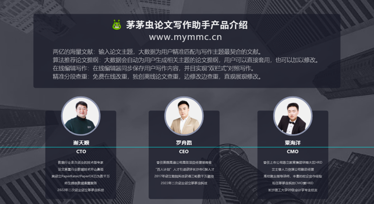 “茅茅虫论文写作助手”平台是由湖南酷陆科技和湖南学搜科技共同组建,致力于“一站式论文写作”的线上写作平台,依托酷陆科技成熟的“区块链技术”以及PaperOK较为成熟的论文大数据库,平台打造了“茅茅虫AI论文助手”,基于大数据产品,解决用户写作中各个环节问题,为用户提高创作效率。目前,湖南酷陆科技已与湖南师范大学外国语学院签订横向科研委托协议,共同开发多语种论文查重功能,与长沙岳麓山国家大学科技城签订了“战略合作协议”,共同推进校企合作项目。