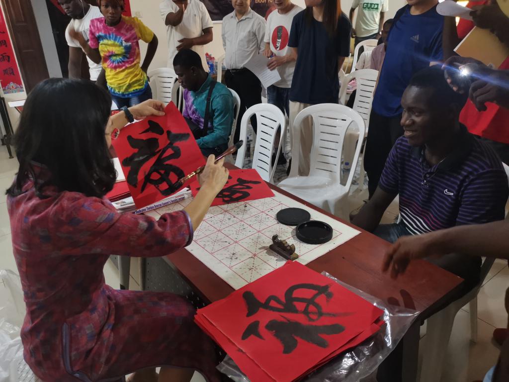 接下来周红专院长教大家写毛笔字。她首先给大家介绍了春节中国人倒贴“福”字的习俗,然后一笔一划展示了“福”字的写法。学生们纷纷拿起毛笔,描摹学写“福”字。在周院长的指导下,蘸墨、落笔、收笔,做得有板有眼,写出来的“福”字也非常工整漂亮。周院长告诉同学们可以把写好的“福”字带回去贴在自家大门上,在利比里亚过一个福气满满的中国年!