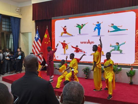 利大孔院的师生们为这次招待会带来了精彩的文艺表演。一首本土歌曲《Mama Liberia》被他们演唱得深情款款、动人心弦。而师生合作的歌舞表演《万疆》表达了对中国的诚挚热爱。来自利大孔院武术课堂的学生们还带来了精彩的武术表演。他们身着传统的武术服装,在舞台上翻转踢打、舞枪弄剑,展现了中国武术的独特魅力。师生们的表演赢得了满堂喝彩。