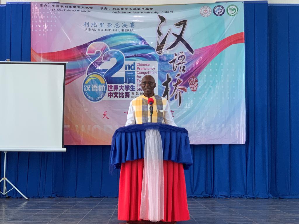 接下来,利比里亚大学副校长代表吉贝发言。他表示,“汉语桥”比赛已经成为了全球范围内推广中华文化和汉语教学的重要平台,也是加深各国友谊的重要途径。他非常感谢各位参赛选手为这次比赛做出的努力和付出,认为无论比赛结果如何,他们已经是利比里亚的骄傲。