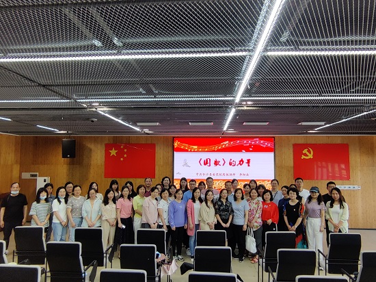 审片室聆听长沙县委党校讲师李阳岳讲授党课《国歌的力量》。李老师分三个部分讲解了《国歌》的由来、《国歌》的精神内涵、《国歌》永恒的价值。党课结束后,大家纷纷起立,注视国旗,与李老师一起高唱国歌。