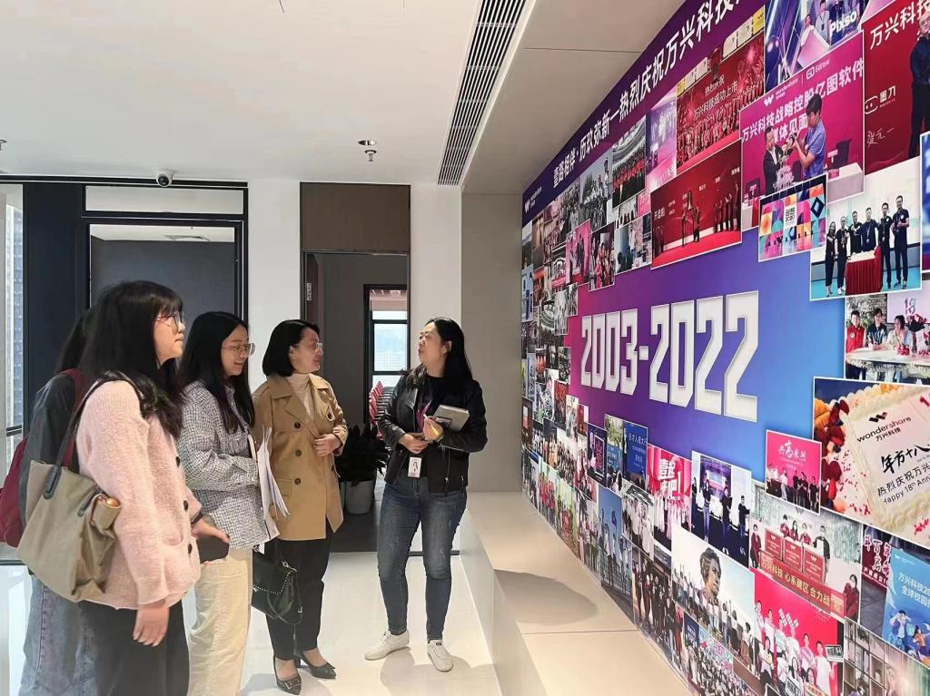 万兴科技校招总监刘莉莉表示对来访师生的欢迎,并带领师生们一起参观万兴科技的办公区域,并在校企座谈会上向在座师生概括介绍了公司的发展史及公司服务领域。