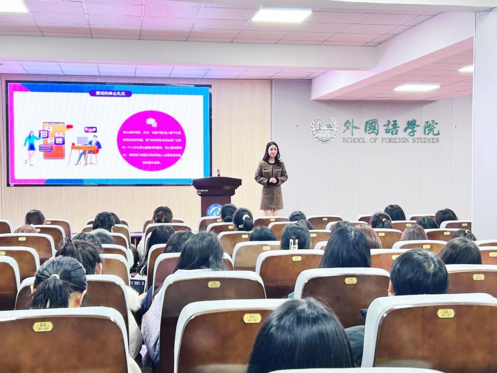 樊明焱老师从面试的仪容礼仪、举止礼仪、语言礼仪三个方面分享求职技巧,绘声绘色地向台下的同学们描述各种场面的应对措施,有效地解答了有些同学不会面试妆容、不懂面试穿搭的难题。本次活动反响热烈,互动积极,很好地激扬了巾帼之志,凝聚了巾帼之力,提升了巾帼之能。