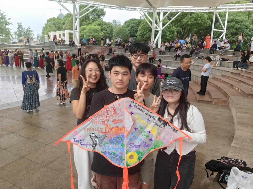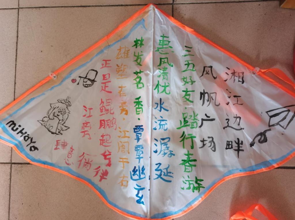 “湘江边畔,风帆广场,三五好友,踏行春游,惠风清忧,水流潺延,林发茗香,覃覃幽玄,雄塑在旁,江阁于右,正是鲲鹏起兮,江旁肆意徜徉”看到如此美好场面,翻译2301的宋宇轩同学诗意大发,在风筝上写道。