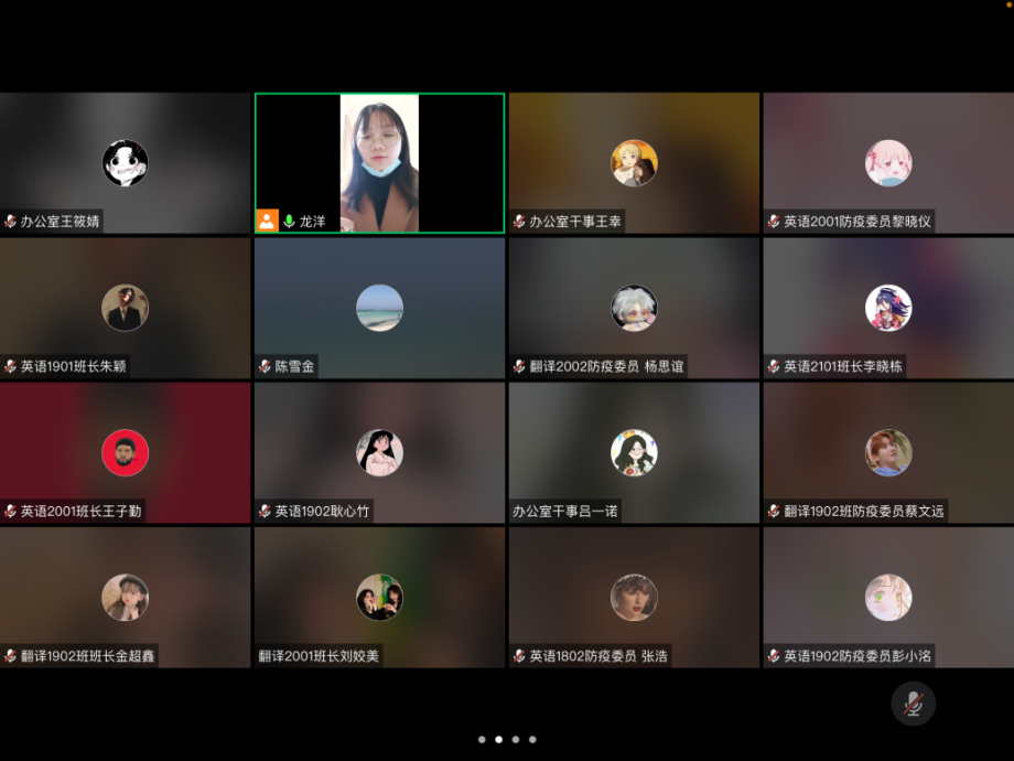 2022年3月27日中午12:30,外国语学院在召开了关于疫情防控及其注意事项的线上视频会议。该会议由日常事务管理辅导员龙洋主持,学生会办公室全体成员、各班班长和防疫委员共33人参加会议。本次会议旨在对疫情防控工作进行规范和说明,进一步增强同学们的防疫意识和责任。
