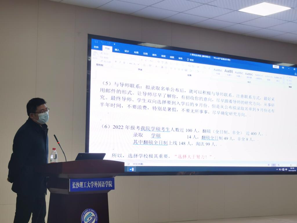 首先,武俊辉给同学们分析了当前考研形势以及考研政策,还解读了有关调剂的政策。他表明,现在要开始做好考研的准备工作,即:根据自己的情况客观地选择学校以及动态评估自己的水平。在信息收集这一方面,他指出,选择大于努力!随后,他带领同学们一起学习张培基散文翻译的几个句子,让同学们了解自己在翻译时所体现出来的缺点,指明今后需要努力的地方。他鼓励同学们在课余时间和他一起探讨翻译问题,提高翻译能力。