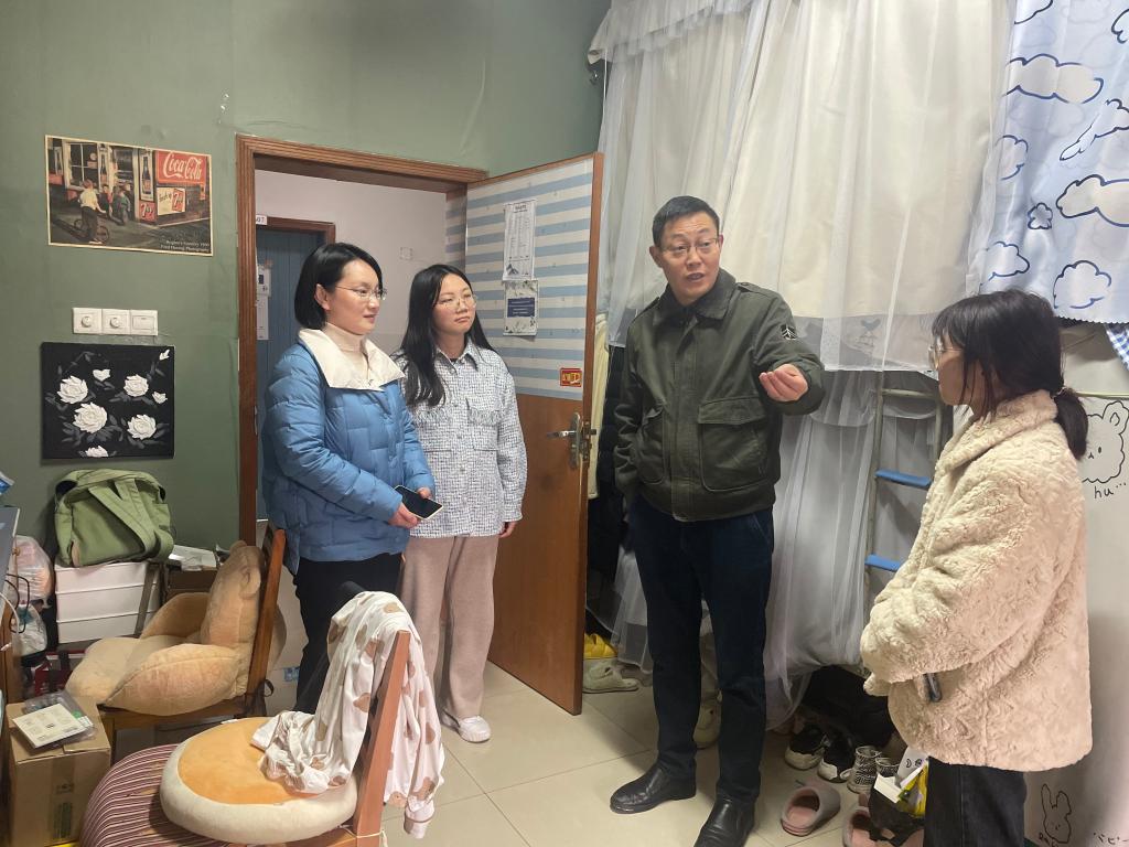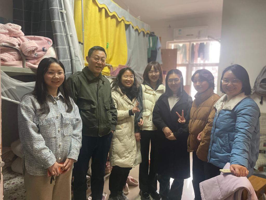 2月23中午12点,外国语学院院长段胜峰、院党委副书记周芳学工办主任武巧琳、毕业班辅导员龙洋深入大三大四学生宿舍,并与学生们进行亲切交流