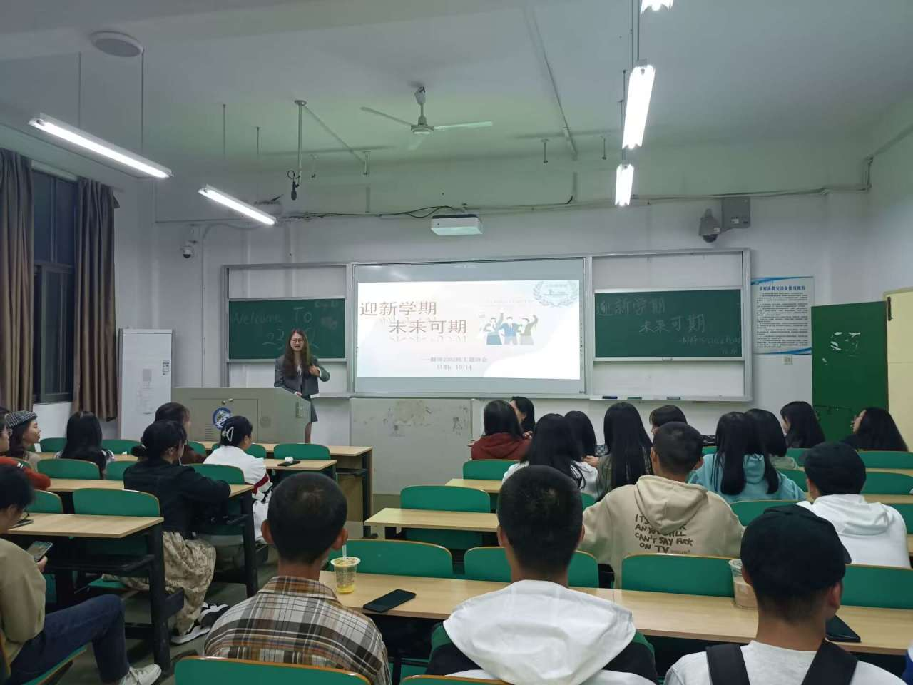 军训生活落下帷幕,征衣未解再跨鞍,为使同学们更好地步入大学生活,10月14日晚上7点,437必赢会员中心外国语学院新生班级在金盆岭校区开展“迎新学期,未来可期”主题班会,全体新生班主任、下班党员、下班干部、全体新生参加班会。